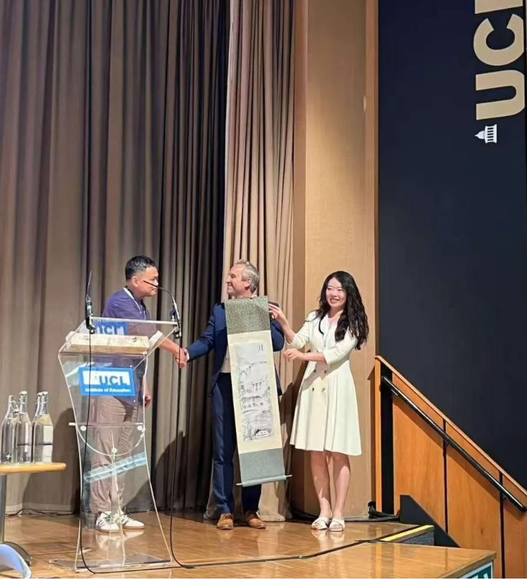张昕、徐广淼老师向新当选的国际中东欧研究理事会主席马蒂亚斯·诺伊曼赠送华东师大校园风貌画轴