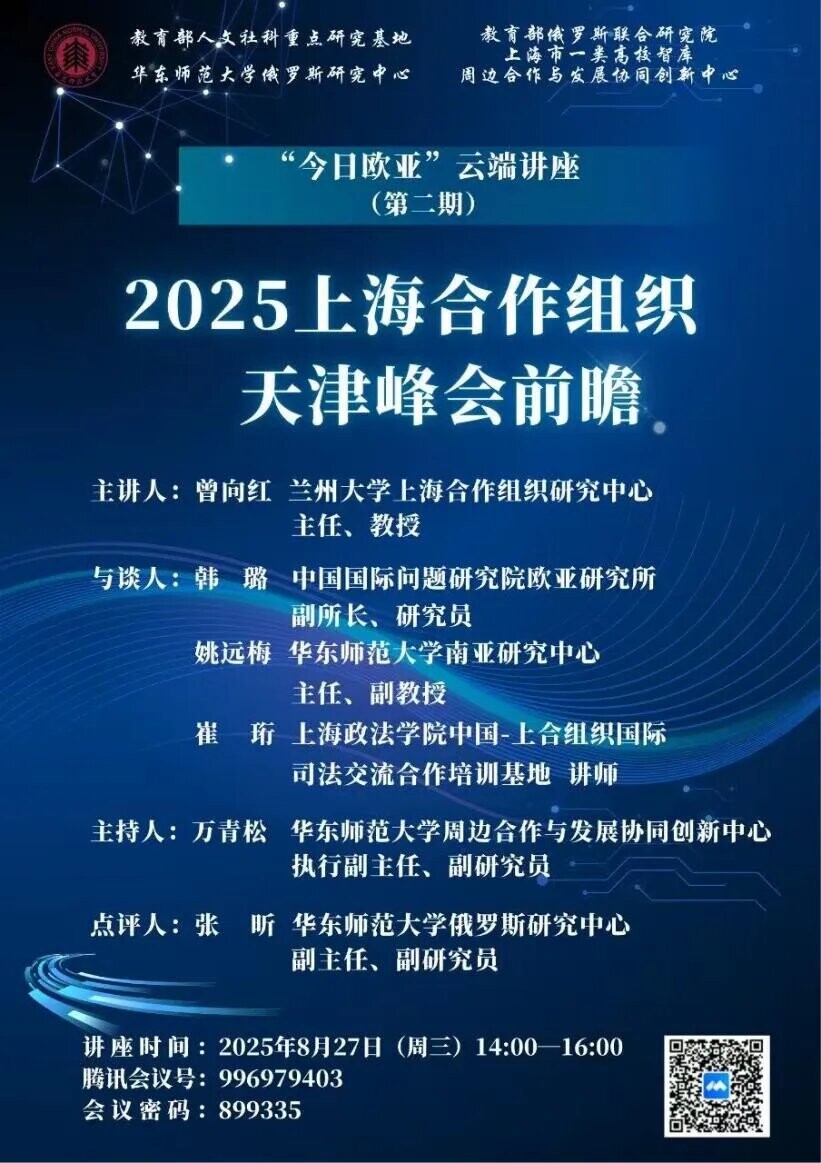 2025年8月27日下午,由教育部人文社科重点研究基地华东师范大学俄罗斯研究中心、教育部俄罗斯联合研究院、上海市一类高校智库华东师范大学周边合作与发展协同创新中心共同发起的“今日欧亚”讲座第二期以线上方式举办。本期聚焦“2025上海合作组织天津峰会前瞻”主题,邀请上合组织研究领域的四位优秀中青年专家分享研究成果,吸引了来自校内外的90余名听众线上参与。讲座由华东师范大学周边合作与发展协同创新中心执行副主任、俄罗斯研究中心副研究员万青松主持。