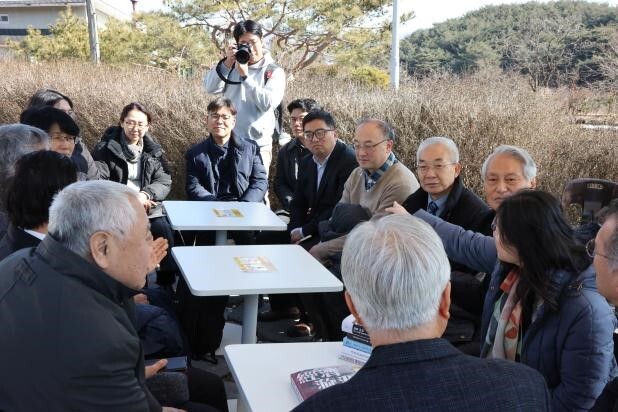 1月31日中午11点30分,沈志华教授、首尔大学统一和平研究院院长金范洙教授和参加第二届长安论坛的中日韩三国学者,与韩国前总统文在寅在釜山坪山书房进行了茶叙。首尔大学白池云副教授介绍了来自中国和日本的各位学者,并重点介绍了沈志华教授在朝鲜战争、中朝关系和冷战史研究领域的成果。沈志华教授向文在寅赠了签名新书《经济旋涡》,并介绍了长安论坛举行的情况和目的。文在寅谈到,自己在任时为中韩关系的改善做了很多的努力,而如今东北亚的局势依旧扑朔迷离,川普总统在他的第二任可能会给朝鲜半岛的局势带来变数。文总统肯定了长安论坛的意义,并鼓励在座的中日韩三国学者应该继续努力为东北亚的和平与发展做出贡献。最后,文在寅总统与三国学者合影留念。