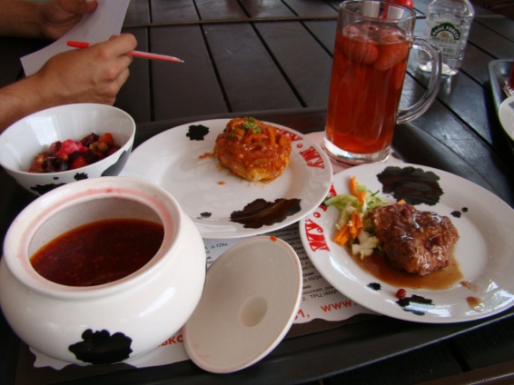 到达的第一天,稍事休整,我们就被带到著名的阿尔巴特大街的mymy餐馆吃饭。正是在这里我第一次接触到一种像草莓汁一样的果汁,味道真是摄人心魄得好喝啊!……之后陆续喝了很多次,味道甜蜜到让人恨不得淹死在里面……配合周董的那首《甜甜的》,脑补一下吧。仅有一次在俄罗斯的跳蚤市场里喝到的这种果汁,虽然颜色相似但比较酸。经过我事后详细地考证,比较有可能是马林果汁。马林果就是名曲《红莓花儿开》中所唱的红莓花!在照片里,红莓花泡到饮料里之后,看起来挺像草莓。