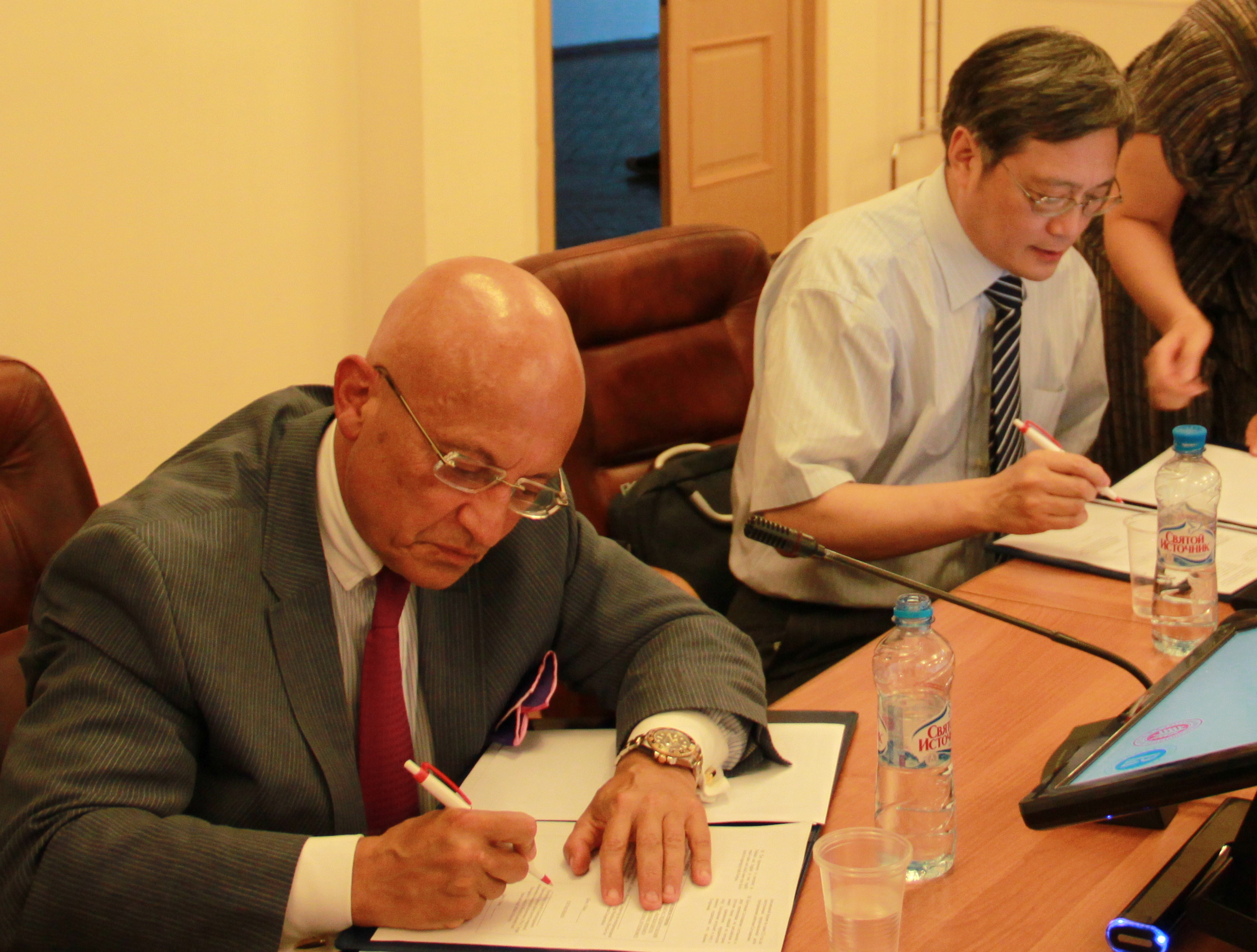 冯绍雷与俄罗斯高等经济研究大学世界经济与政治系主任、“瓦尔代”国际辩论俱乐部主任卡拉加诺夫代表双方签约