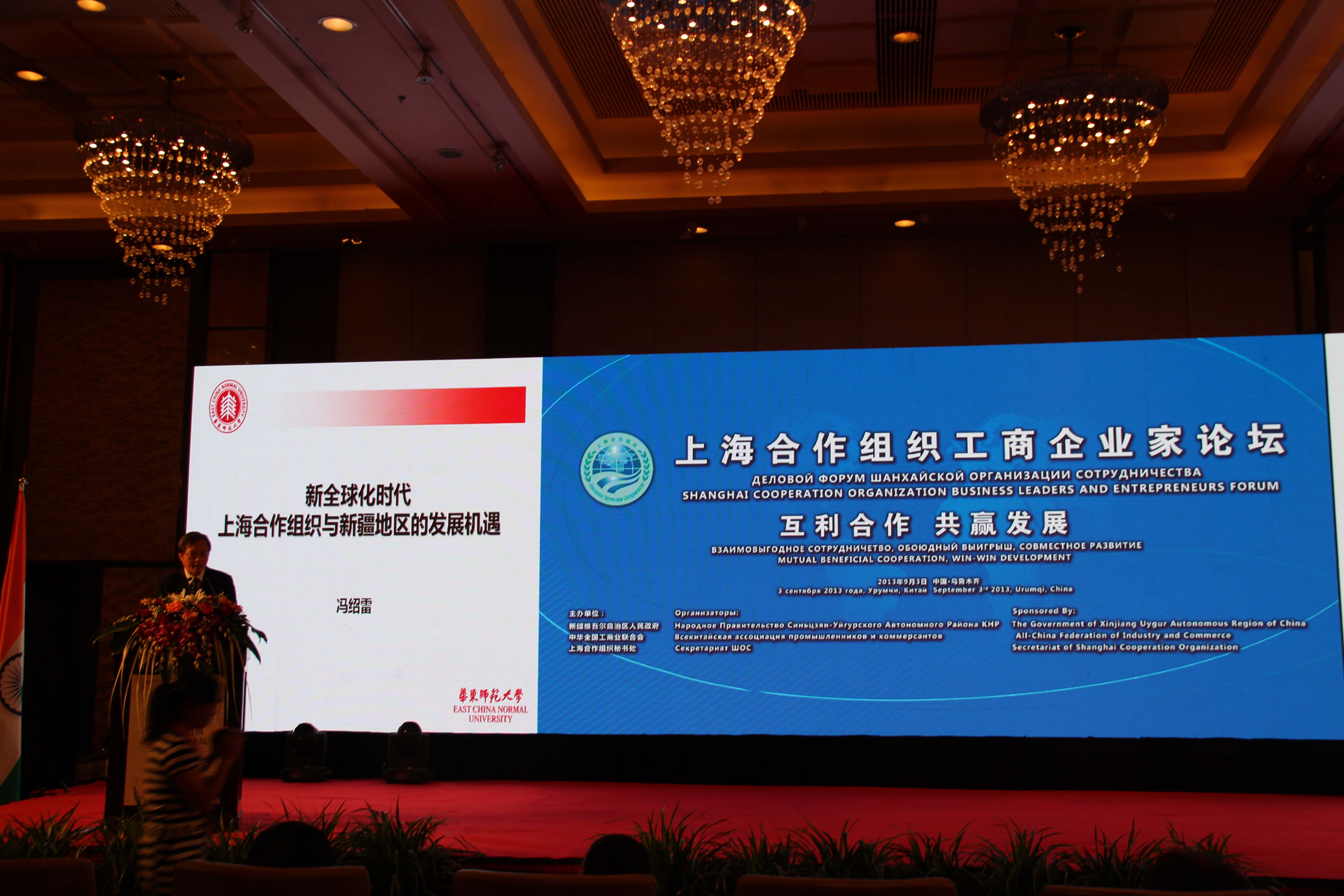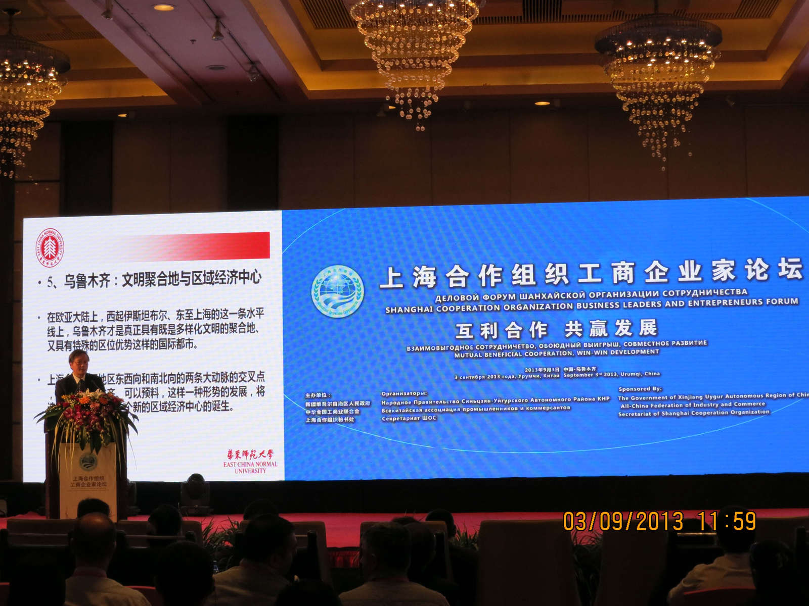 2013年9月3日上午,我院冯绍雷教授应邀参加了中国—亚欧博览会在乌鲁木齐市喜来登酒店举办的上海合作组织工商企业家论坛,并在论坛上做了题为“新全球化时代上海合作组织与新疆地区的发展机遇”的主旨演讲。