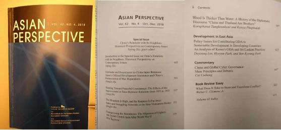 在周边中心主任沈志华教授的带领下,在周边中心研究员夏亚峰和梁志的组织下,周边中心研究团队(包括夏亚峰、梁志、徐显芬、艾苏和陈玉珊在内)在Asian Perspective(SSCI)的专刊上发表,主题为“China’s Relations with Its Neighbors: Historical Perspectives on Contemporary Issues”(中国与邻国关系:当代问题的历史视角)