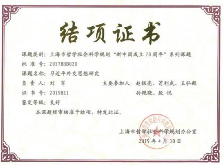 2019年7月,周边中心刘军研究员主持的上海市哲学社会科学规划“新中国成立70周年”系列课题成功结项。刘军主持的课题名称为“习近平外交思想研究”,成果完成的质量被评定为良好。